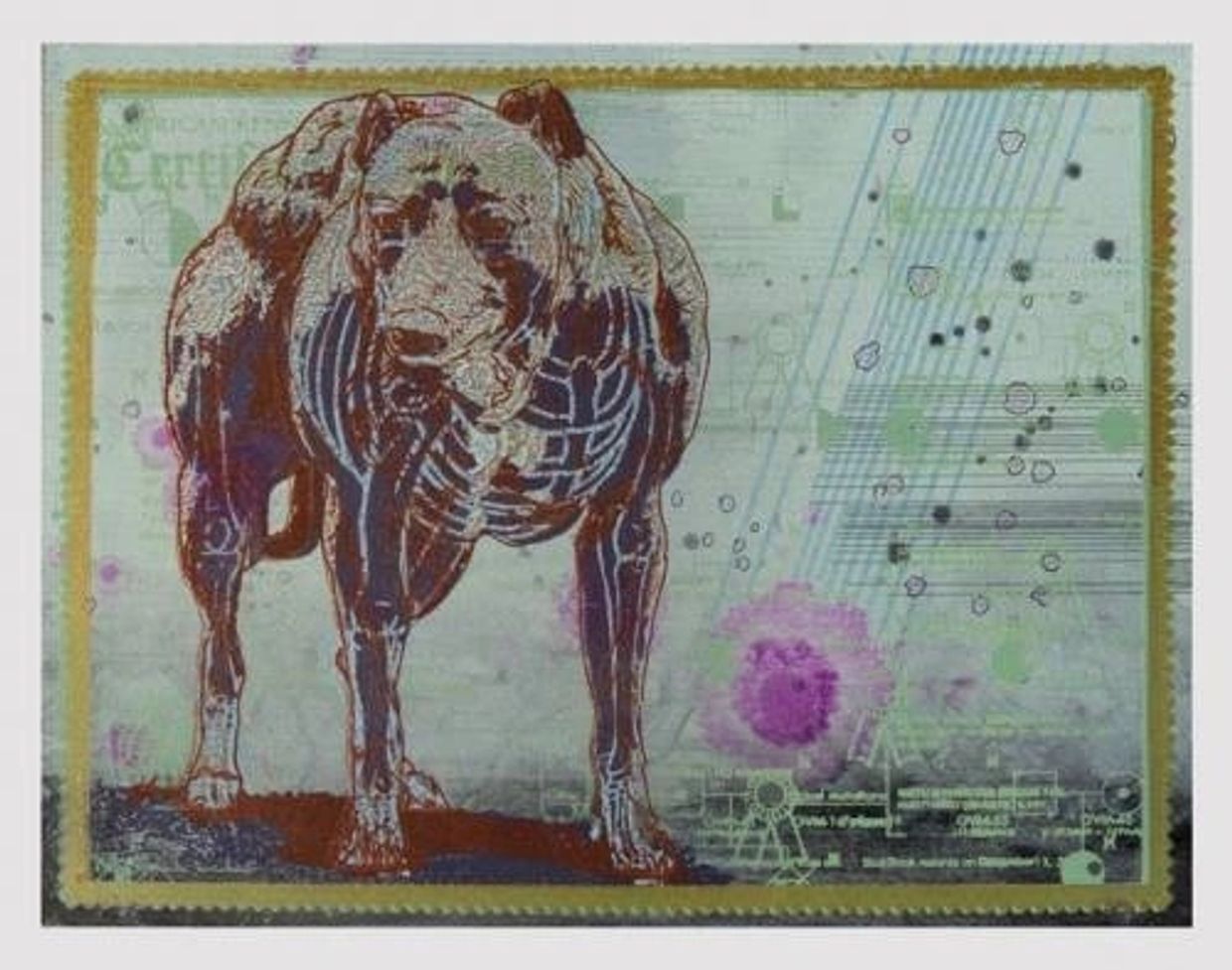 At the opening for visibletraces, I ran into one of the curators of the "Tiny Thumbs" pop-up arcades that debuted at CentralTrak a few months ago (and reappears at the next DMA Late Night). He was going crazy over Munoz's mechanical creatures, forever locked in their Birch-panel, science-fiction world. Most of Munoz's paintings in this show look like docudramas from outerspace, but my favorite was "Self Examination Series," a series of 20 panels ripped from the cheekiest biology textbook that never existed. "Blue Bloods & Gammy Rays, " an engrossing and weird diagram starring a dog with too many muscles, conveys our collective anxiety over our growing dependency on technology. It's an unsettling dystopia, and by the looks of things, it ain't gonna turn out so well for humans, but it does make for one hell of a painting.